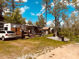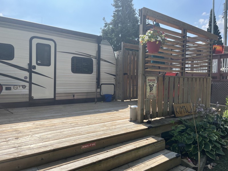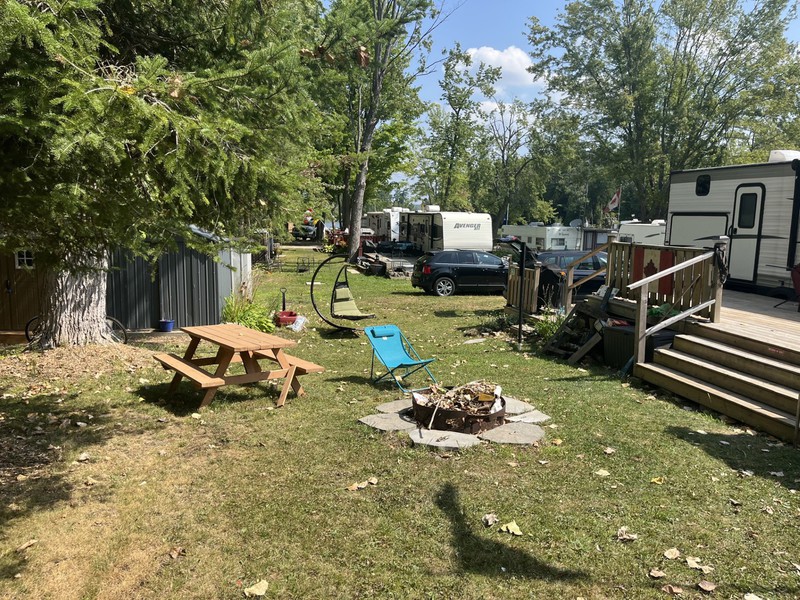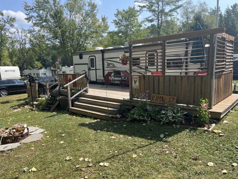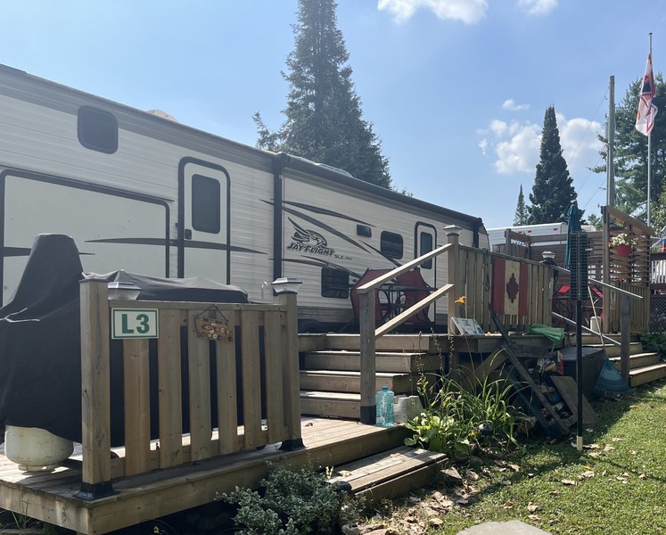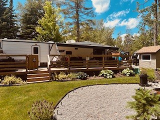 ONLY 1 OWNER – NEVER TOWED - CLEAN & WELL MAINTAINED – 2 LARGE SLIDE OUTS -CAN SLEEP 8-10 PEOPLE – U SHAPED DINETTE - LARGE BUNK ROOM (2 BUNKS AND FUTON THAT FOLDS TO QUEEN BED) – FRIDGE CAN BE GAS OR ELECTRIC - 3 BURNER STOVE W/OVEN – FURNACE - A/C – STEREO – BATHROOM HAS DUAL ENTRY - BRAND NEW (1 MONTH) POWER AWNING WITH LED LIGHTS – OUTDOOR KITCHEN WITH FRIDGE AND 2 BURNER COOKTOP – 2 PROPANE TANKS - 40’ DECK WITH PRIVACY CORNER – INCLUDES ALL OUTDOOR FURNITURE & PICNIC TABLE – 8’ X 10’ METAL SHED – ALL DISHES – CUTLERY – POTS AND PANS – LEVELLING JACKS BRAND NEW (NEVER USED) - TIRES ARE BRAND NEW - $41,500 PLUS 2026 SEASON FEE. BEAUTIFUL LARGE LOT WITH SUN & SHADE – CLOSE TO BEACH AND BOAT LAUNCH.