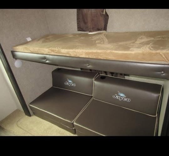 a private front queen bedroom, rear bunkhouse (3 bunks + convertible dinette), and sofa/dinette conversions.